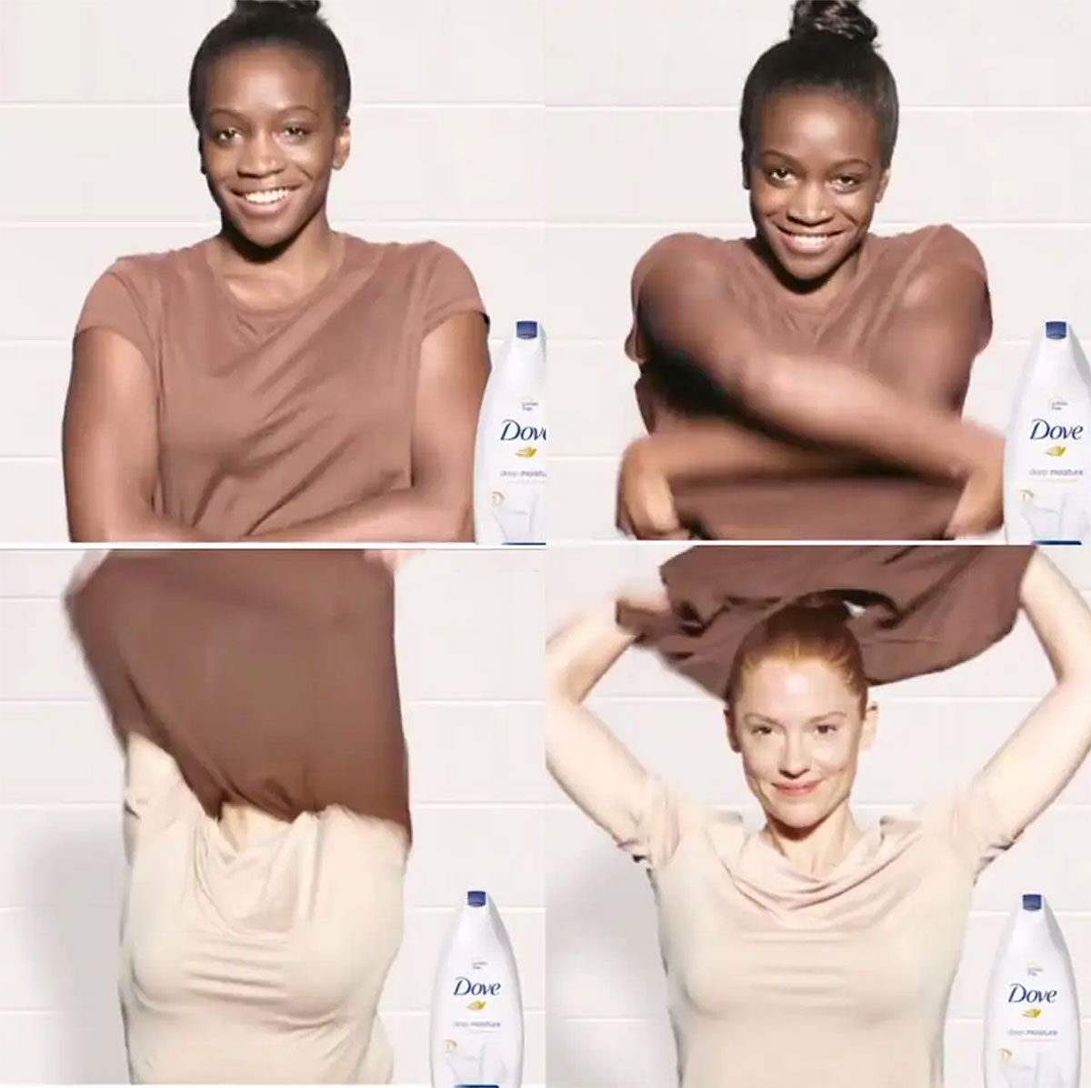 Le paradoxe : Dove, la marque championne de la diversité et de l’inclusion avec sa campagne « Real Beauty », publie une publicité montrant une femme noire qui retire son t-shirt et se transforme en femme blanche après avoir utilisé le produit.