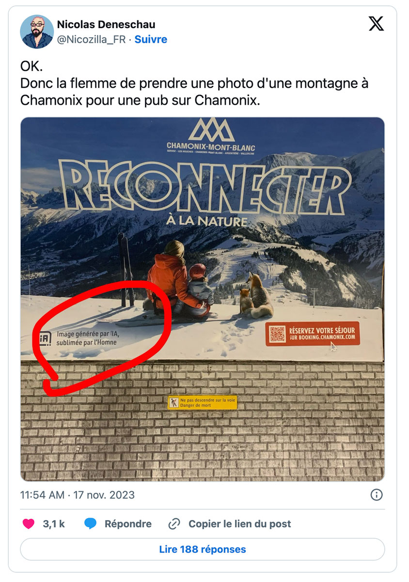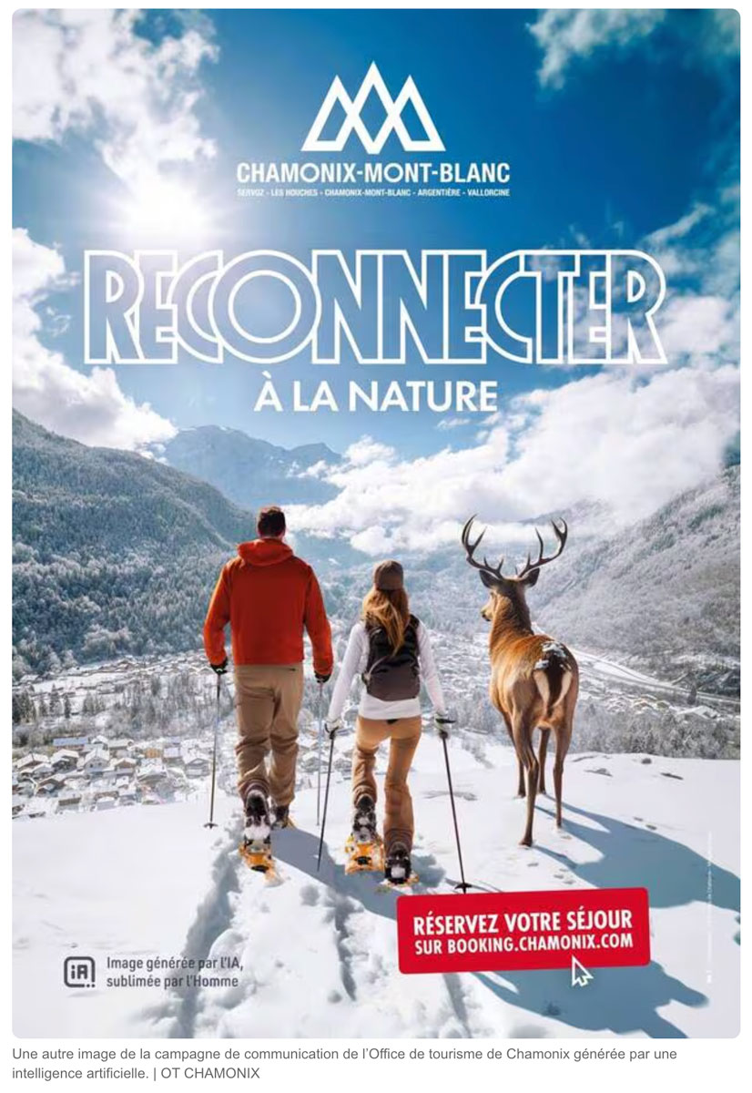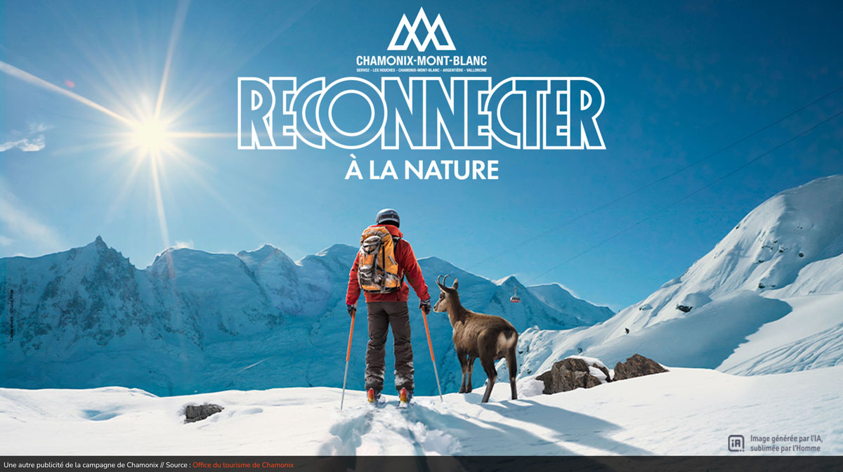 La bourde : l’office de tourisme de Chamonix dévoile sa campagne hivernale avec des visuels générés par IA, accompagnés de la mention « Image générée par l’IA, sublimée par l’homme ».