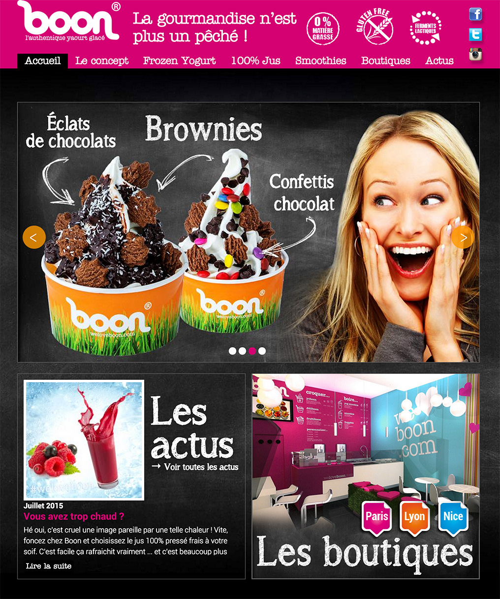 Le site est orienté grand public avec une large place aux photos produits et photos de nombreux fans de Boon dégustant les fameux yaourts glacés 0% de matière grasse !